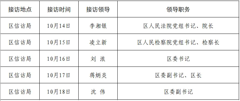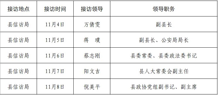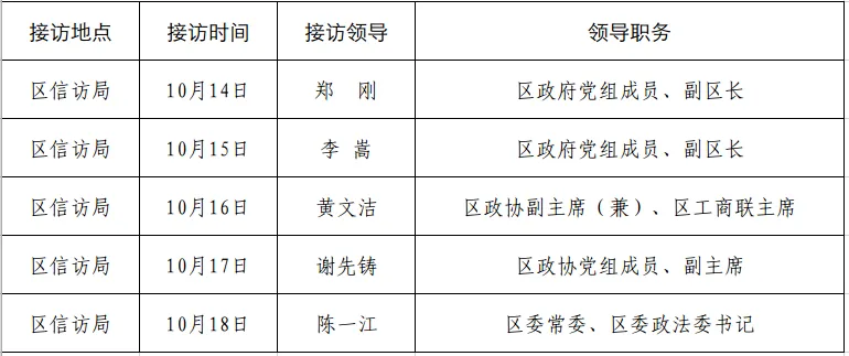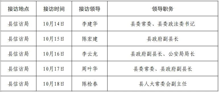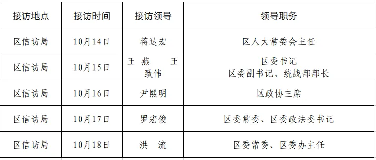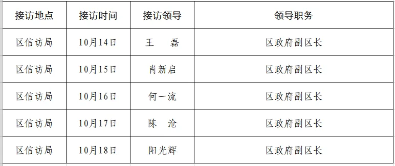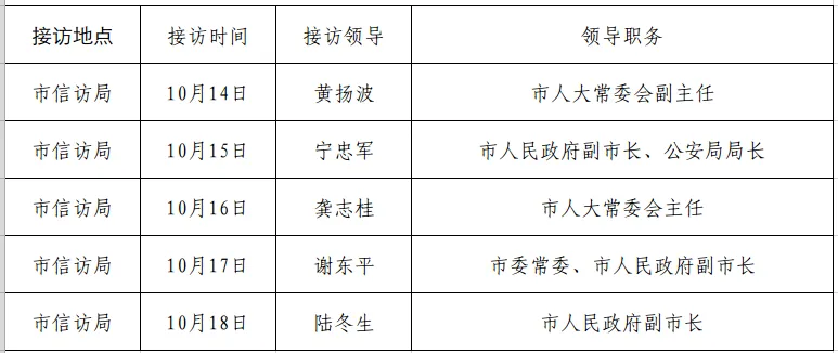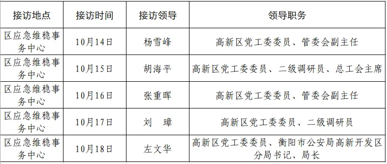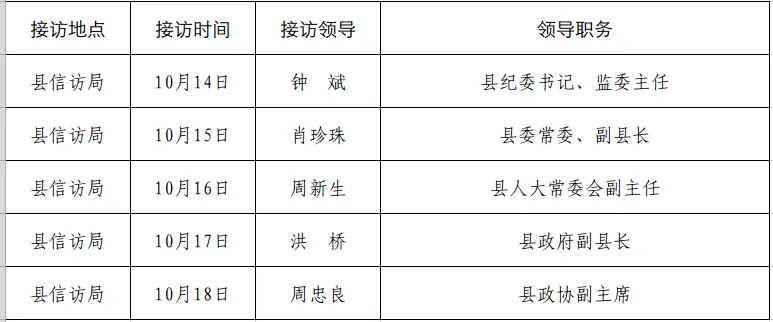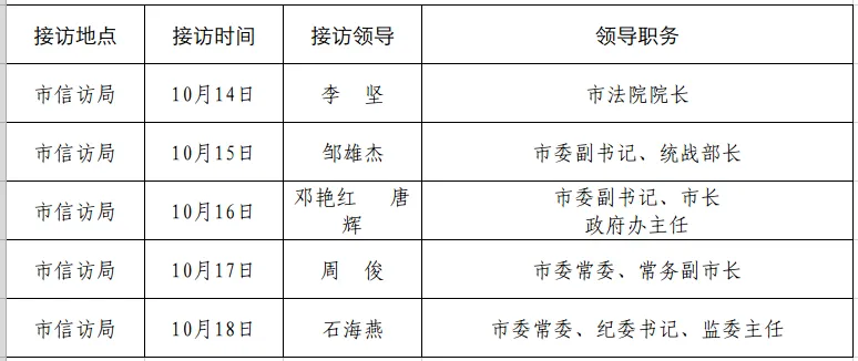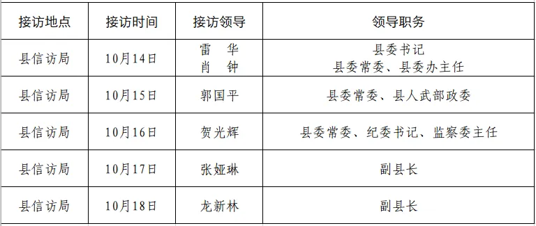 为深入贯彻落实《信访工作条例》,进一步畅通信访渠道,密切领导干部与人民群众的联系,依法按政策解决群众合理合法诉求,现将10月8日—10月12日衡阳市县(市、区)领导干部公开接访工作安排公告如下: